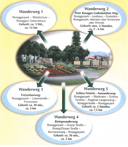 Die Themenwanderwege, die teilweise auf öffentlichen Straßen bzw. auch über Privatgrundstücke führen, wurden von der Marktgemeinde Krieglach beschildert und haben alle Wanderwege den Roseggerpark als gemeinsamen Ausgangspunkt.