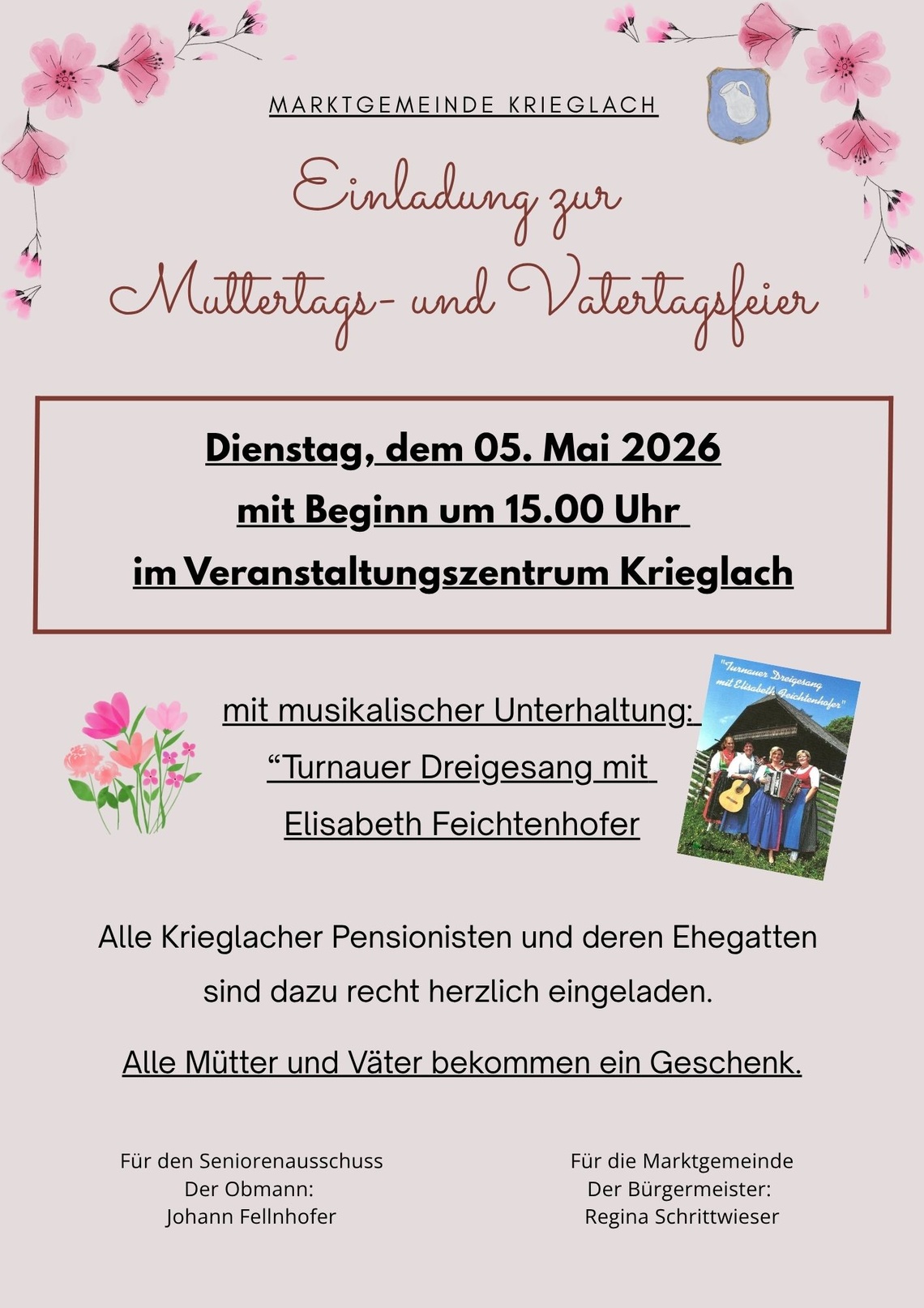 TitelMuttertags- und VatertagsfeierDatumDienstag, 05.05.2026Uhrzeit15.00 UhrVeranstalterSeniorenreferat der Marktgemeinde KrieglachOrtVAZ Krieglach[mehr]